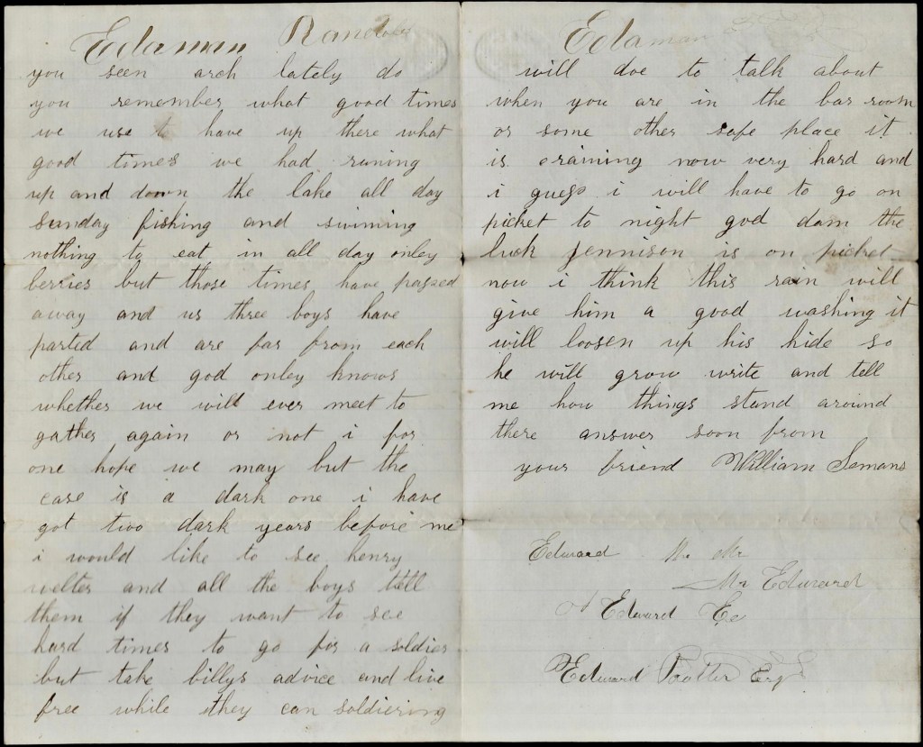 It is raining now very hard and I guess I will have to go on picket tonight. God damn the luck. Jennison 1 is on picket now, I think. This rain will give him a good washing. It will loosen up his hide so he will grow. Write and tell me how things stand around there. Answer soon. From your friend, — William Semans.