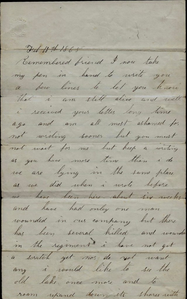 We are lying in the same place as we did when I wrote before. We have been here about six weeks and have had only one man wounded in our company but there has been several killed and wounded in the regiment. I have not got a scratch yet nor do not want any. I would like to see the old lake once more and to roam up and down its shores with you and Old Carmer. Then was when I enjoyed myself eating berries and stealing Mr. Conkling’s apples. But apples are scarce here. They cost five cents apiece and not very large at that.