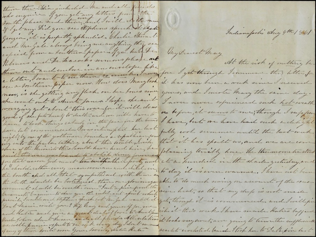 I was interrupted here last night by one of the gentlemen boarders—a Republican—coming into the parlor talking about this trouble. I wish some of the Unionists there could have heard him. He said this war was bound to abolish slavery forever and for that reason, God must be with their party and he “should rather every man, woman, and child in the South and all that sympathized with them in the North, should be butchered than our glorious government should be overthrown.” Just a piece from Cincinnati Enquirer to show you the intolerant spirit which prevails. I would send Stephens’ speech but Mr. Gale wanted it.