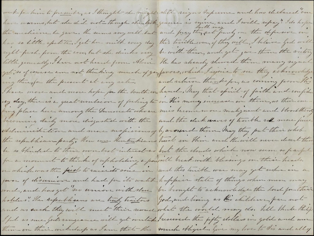 I have more and more hope for the South every day. There is a great revulsion of feeling taking place here among the Democrats who are becoming daily more disgusted with the [Lincoln] Administration and more suspicious of the republican Party. How can Kentuckians be so blinded to their own best interest as for a moment to think of upholding a power which was the first to raise its voice in favor of disunion and had for its watchword, and has yet, “No union with slave holders.” The republicans are truly traitors and as such they will meet their reward. I feel as sure God’s vengeance will yet overtake them in their wickedness as I am that He still reigns supreme and has declared “vengeance is mine, and I will repay.” I do hope and pray the South may act purely on the defensive in this terrible war. If they will, I believe God will be with them, and yet give them the victory. He has already showed them many signal favors, which I rejoice to see they acknowledge and return thanks for as coming from His hand. May that spirit of faith and confidence in His mercy increase in them, as their enemies become more malignant and bloodthirsty and the dark waves of trouble roll more fiercely around them. May they put their whole trust in Him and He will never desert them but the clouds which now seem so fearful will break with blessings on their heads and this terrible war may yet usher in a happier state of things when men may be brought to acknowledge the Lord God their God, and living as His children, fear not what the world may do.