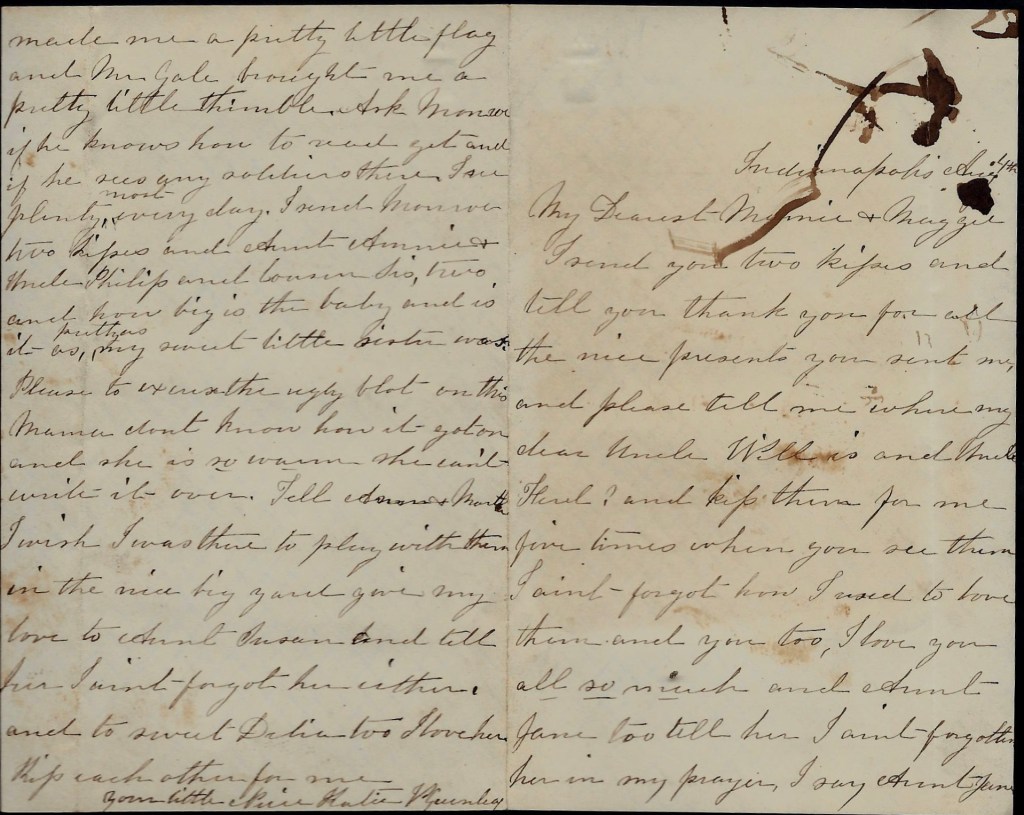 Katie Noble has gone to Crawfordsville but I have a right nice time here for I have Lizzie Anderson to play with. I can just open the back gate and go right in there but I have to ask Mama though. Mrs. Gale made me a pretty little flag and Mr. Gale brought me a pretty little thimble. Ask Monroe if he knows how to read yet and if he sees any soldiers there. I see plenty most every day. I send Monroe two kisses and Aunt Annie & Uncle Philip and cousin Sis two. And how big is the baby? And is it pretty as my sweet little sister was?