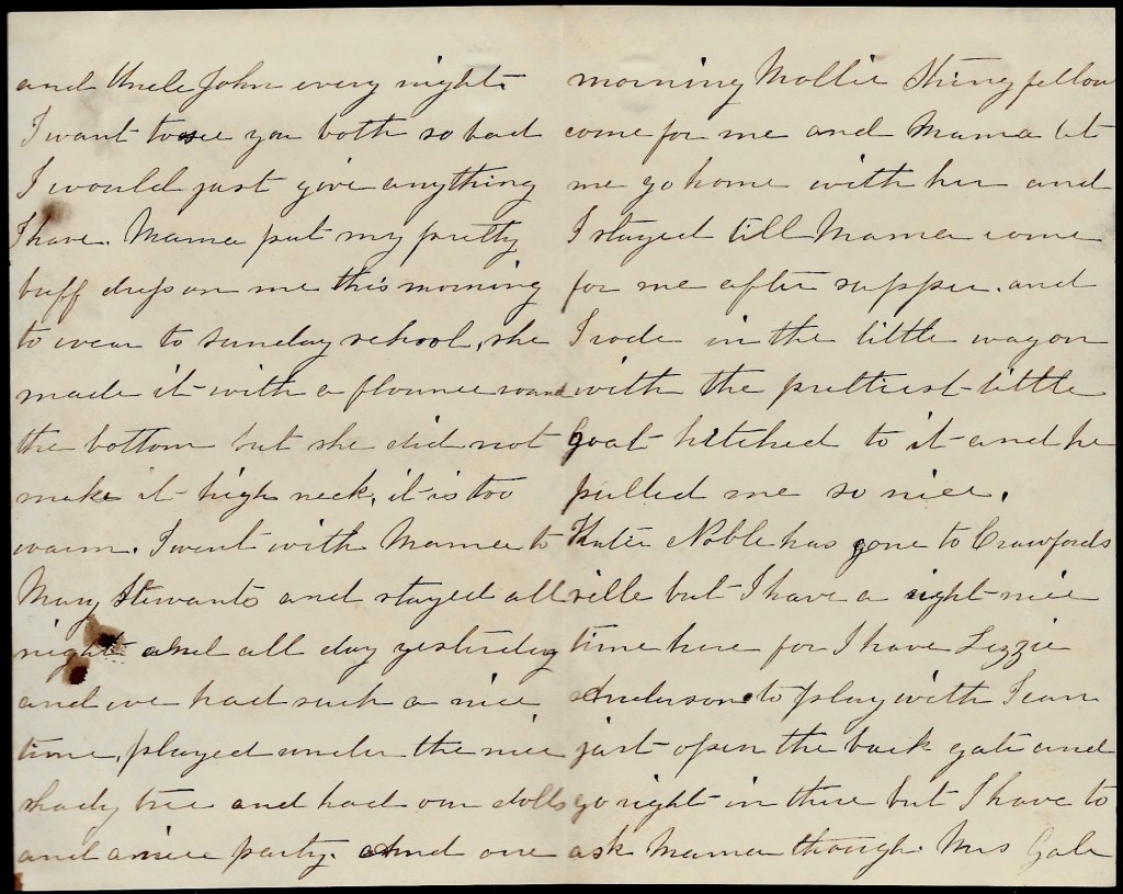 I went with Mama to Mary Stewarts and stayed all night and all day yesterday and we had such a nice time. Played under the nice shady tree and had our dolls and a nice party. And one morning Mollie Stringfellow come for me and Mama let me go home with her and I stayed till Momma come for me after supper and I rode in the little wagon with the prettiest little goat hitched to it and he pulled me so nice.