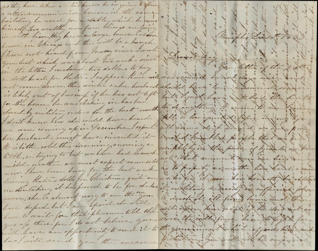 It is bitter cold this morning. Snowing a little, or trying to, but we have had so much mild weather we must expect some cold now/ I have been busy for the last week dressing Katie’s dolls for Christmas—quite an undertaking it has proved to be for she has seven. She is almost crazy to see the one you have dressed but I am afraid she will have to wait for that pleasure till she goes up there for I do not believe you will have an opportunity to send it to her. I will send you the measure of her skirt in this and I know you will be surprised when you see it—she is growing so fast. Stewart has been with us for the last two weeks. He came to get a situation with Alvin. I expect he will send him down the river to buy cotton for him.
