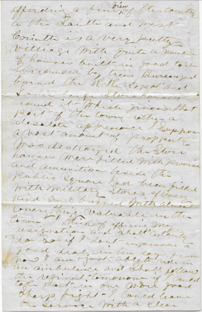 This is one of the finest camping grounds I have seen situated on a ridge of hills affording a fine view of the country to the south and west. Corinth is a very pretty village with quite a number of houses built in good taste surrounded by trees. Beauregard burned the railroad depot and some large storehouses around it which gives that part of the town rather a desolate appearance. I suppose a vast amount of property was destroyed. The storehouses were filled with provisions and ammunition beside the public square had been filled with military stores of every kind and burned with almost everything valuable in the town.