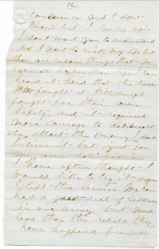 I think of offering my resignation and shall certainly do so if I don’t improve a good deal in ten days from now. I am just able to ride in an ambulance and shall follow the regiment tomorrow. If I could take part in one more good sharp fight, I could leave the service with a clear conscience and I don’t know but I could now. I don’t want you to understand that I want to risk my life but there are certain things that we estimate higher than life. I have heard it said that the troops who fought at Pittsburg [Landing], fought for their own safety and it required more courage to deliberately attack the enemy. I don’t believe it, but just for my own satisfaction I have often thought I would like to try it before I left the service.