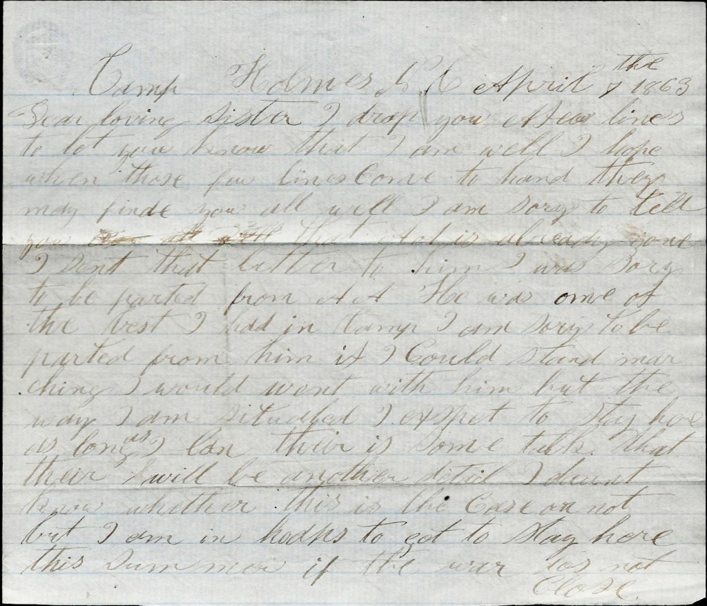 I drop you a few lines to let you know that I am well. I hope when these few lines come to hand, they may find you all well. I am sorry to tell you that A. A. is already gone. I sent that letter to him. I was sorry to be parted from A. A. He was one of the best [friends] I had in camp. I am sorry to be parted from him. If I could stand marching, I would [have] went with him but the way I am situated, I expect to stay here as long as I can.