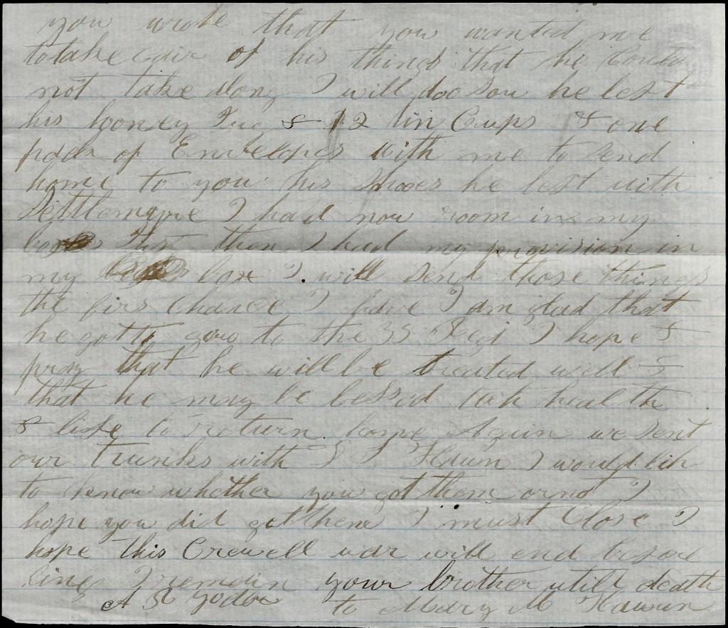 You wrote that you wanted me to take care of his things that he could not take along. I will do so. He left his honey jug & two tin cups & one pack of envelopes with me to send home to you. His shoes he left with Saddlemire. I had no room in my bag just then. I had my provisions in my box. I will send those things the first chance I have.