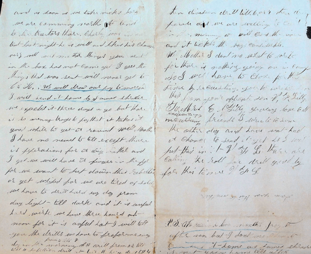 Well, Mother, I have no news to tell except there is preparations for a big battle and I guess we will have a finger in the pie for we want to put down this rebellion or get whipped for we are tired of soldiering. We have to drill hard every day from daylight till dark and it is awful hard work. We have three hours [off] at noon for it is awful hot. I will tell you the drills we have to perform every day. In the morning from 6 till 8 company drill, from 8:30 till 11 Battalion drill. Brigade drill 11 till 4. Then Division drill till 6 tor 7. Then dress parade and we are willing to quit. In the morning we will cross the river and it tickles the boys considerable.