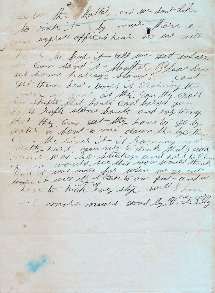P. S. I received the package of papers and book you sent to us. We are going to draw our pay this week and will send it home by James Shrader. No more. This from you affectionate brother, — V. F. Lilly.