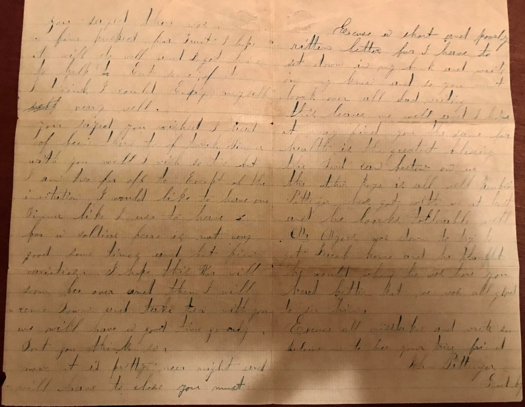Mr. Myers was down to try to get Jacob home and he thought he would when he was here. You had better bet we was all glad to see him. Excuse all mistakes and write soon. Believe me to be your true friend, — John Pittenger