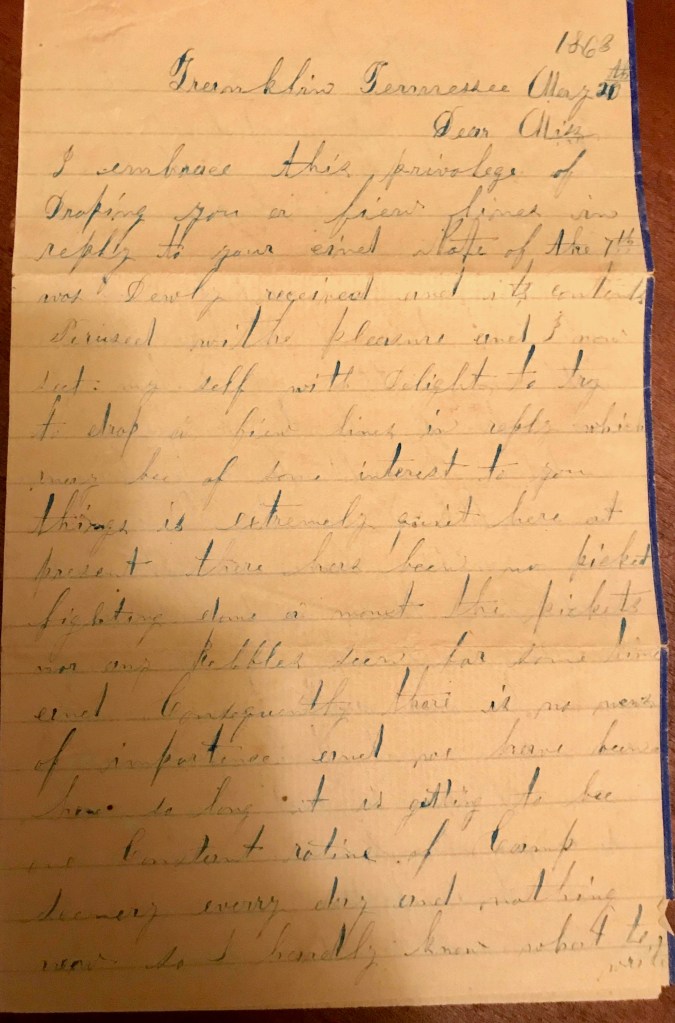 Things is extremely quiet here at present. There has been no picket fighting done amongst the pickets nor any Rebels seen for some time and consequently there is no news of importance and we have been here so long it is getting to be one constant routine of camp scenery every day and nothing new so I hardly know what to write.