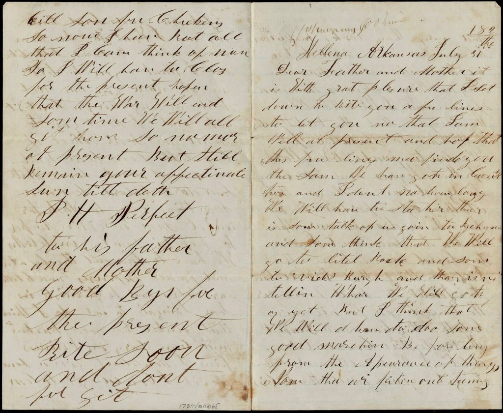 This letter was written by Joshua Hickman Perfect (1843-1864), the son of Joshua H. Perfect (1815-1882) and Sarah Jane Shields (1822-1843) of West Point, White county, Indiana. Joshua’s mother died giving birth to him and not long after remarried his wife’s younger sister, Nancy Maria Shields (1824-1906). It fell to Nancy to raise her sister’s three children as well as the additional 12 children she bore of her own.