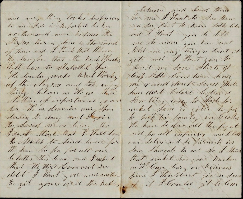 There is nothing of importance going on here. We are drawing our [money] today and I am going to send mine home though I don’t think that I will have too much to send home for we have to pay for all our clothes this time and I expect that we will come out in debt. I want you and mother to get yourselves and the babies likenesses and send them to me. I want to see them and see what the babies looks like and I want you to tell me its name. You have not told me anything about it yet and I want you to send me some shirts if Capt. [Robert W.] Sill comes home. Send me 4 and don’t send white. [Send] some dark collared calico or something easy to wash for Uncle Sam is getting too poor to keep his family in clothes. We have to do all the fighting and pay all expenses and clothe ourselves and he furnishes us some shingles to eat so I think that Uncle has good bacon and he can carry on business fine. I wouldn’t give a cent if I could get to kill some few chickens.