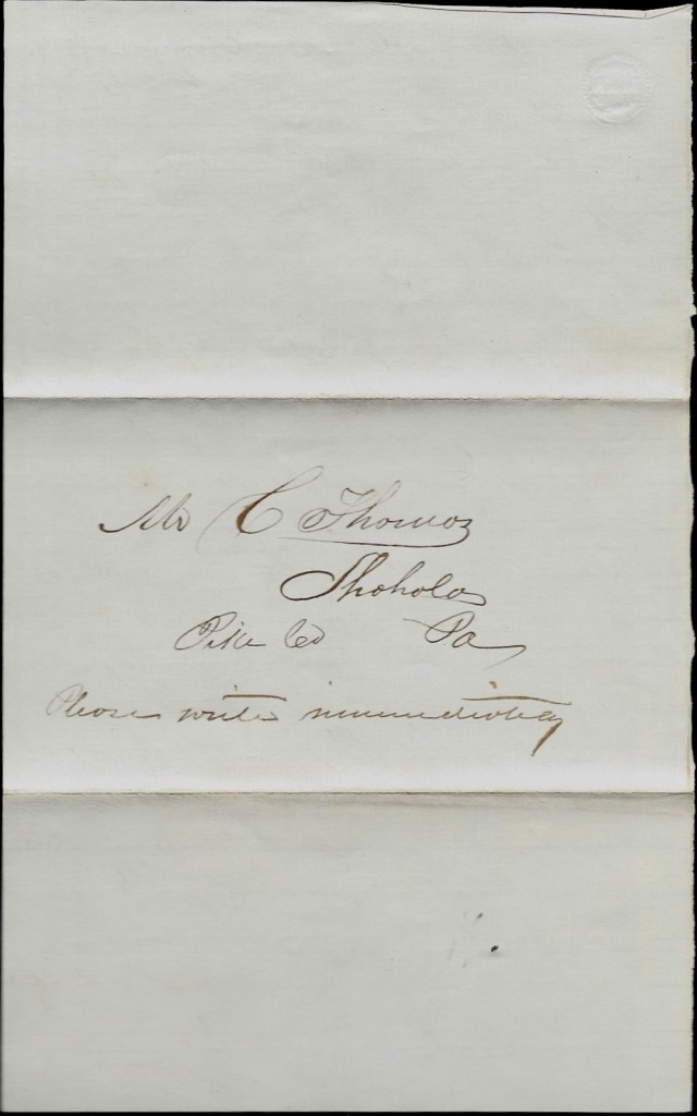 This letter was written by H. C. Hicks, most likely a Confederate prisoner held at the Elmira Prison Camp in Elmira, New York. He wrote the letter to Chauncey Thomas, Sr. (1813-1882), one of eleven children born to mill owner and entrepreneur Moses Thomas and his wife, Rebecca Monington of Damascus, Wayne county, Pennsylvania. He is probably best known as the owner of the four Barryville–Shohola Bridges over the Delaware River, and as the father of Rear Admiral and Commander in Chief of the Pacific Fleet, Chauncey Thomas Jr., USN.