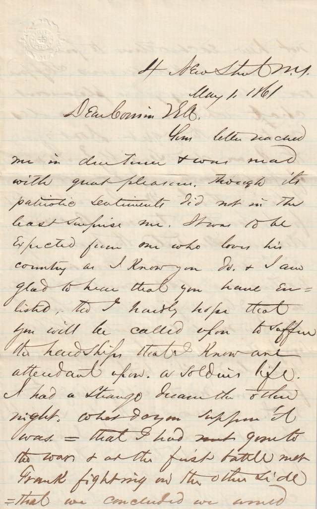 I had a strange dream the other night. What do you suppose it was—that I had gone to the war & at the first battle met Frank 1 fighting on the other side—that we concluded we would not hew each other to pieces & so with locked arms stepped one side & enjoyed a pleasant chat while our comrades continued to fight. Don’t you think we did sensibly? A matter of fact, however, I do not believe that Frank will enlist for the Southern treason. But my dream illustrates the horrors of civil war in which cousins & brothers are likely to meet each other in deadly conflict. But this I think is much exaggerated. Peoples sympathies seem to lean very much to the land of their birth & so very few born North will fight for the South & vice versa. Therefore, I would not put arms in the hands of any of the [border?] State men. They cannot be trusted until there is no chance for successful rebellion.