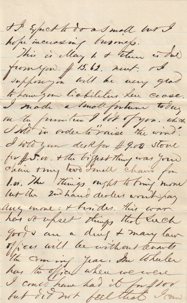 This is May 1 & there is due from you $15.62 rent & I suppose you will be very glad to have your liabilities here cease. I made a small fortune today on the furniture I bought of you which I sold in order to “raise the wind.” I sold your desk for $9, stone for $5 and the biggest thing was your chair & my two small chairs for $1. The things ought to bring more but the 2nd hand dealers won’t pay any more; and besides, this war has upset things that such goods are a drag and many law offices will be without tenants the coming year. Mr. Wheeler has the office where we were. I could have had it for $100 but did not feel that I can afford to pay any more than I am paying here $60. Law offices are renting very cheap, Soldiering may be the best business going next year.
