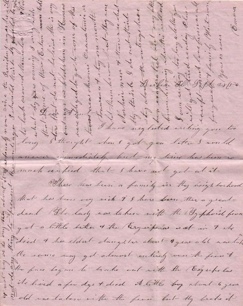 There has been a family in the neighborhood that has been very sick & I have been there a great deal. The lady was taken with the typhoid fever, got a little better, & the erysipelas set in & she died. And her eldest daughter—about 9 years old—was taken the same way; got almost entirely over the fever & the face began to break out with the erysipelas. She lived a few days & died. A little boy about 6 years old was taken with the fever but they broke it up so it did not have a full run. But the day the little girl died, his face began to break out & swell. They got a physician from Springfield that succeeded in stopping it. Some think he is gaining slowly & some think he will never get well. He is not able to sit up any now. They have a little babe left, 6 months old, without a mother. He is a pretty little thing. I have had him & took care of him 2 weeks. They carried him home to his grandfather yesterday. With the exception of this family there has been no sickness in this vicinity this summer.
