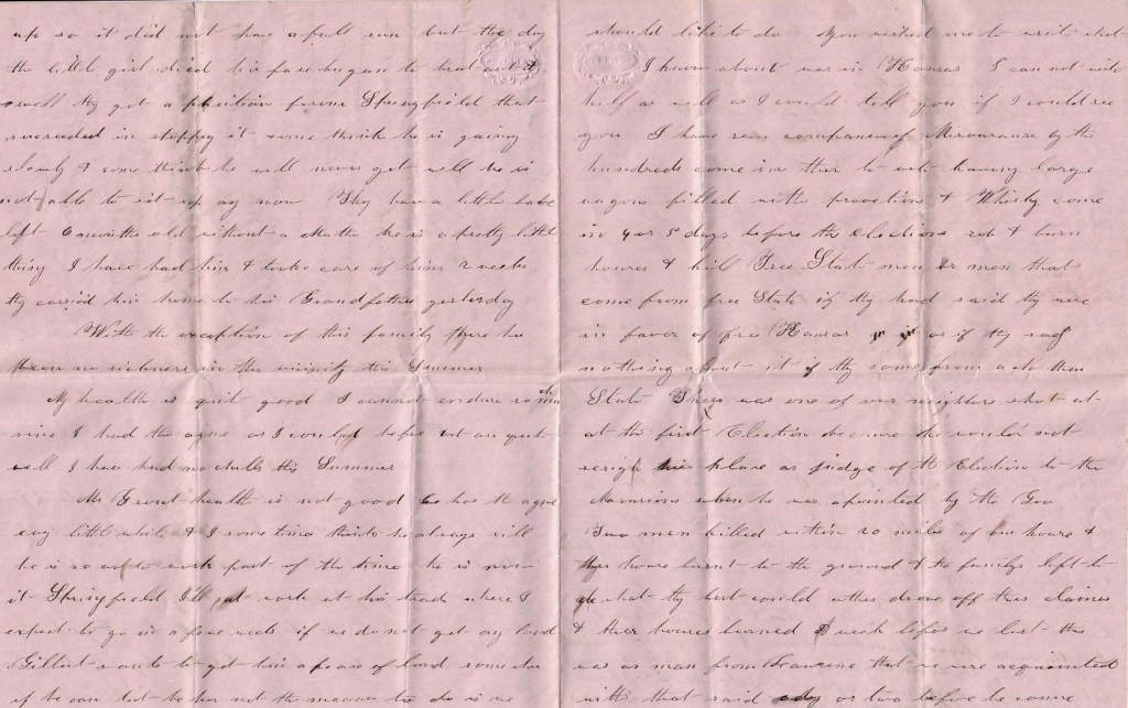 There has been a great battle at Osawatomie within a few weeks. 1 Several men [were] killed & others drove from their homes and everything they had in the world left there to be destroyed. Two of the men went through Springfield & Gilbert saw them but I have not seen them & do not know whether they was anyone we knew or not. Gilman & his brother was out there that day & saw them & said that they were drove from their farms 1 mile from Osawatomie and left everything to be destroyed if they chose.