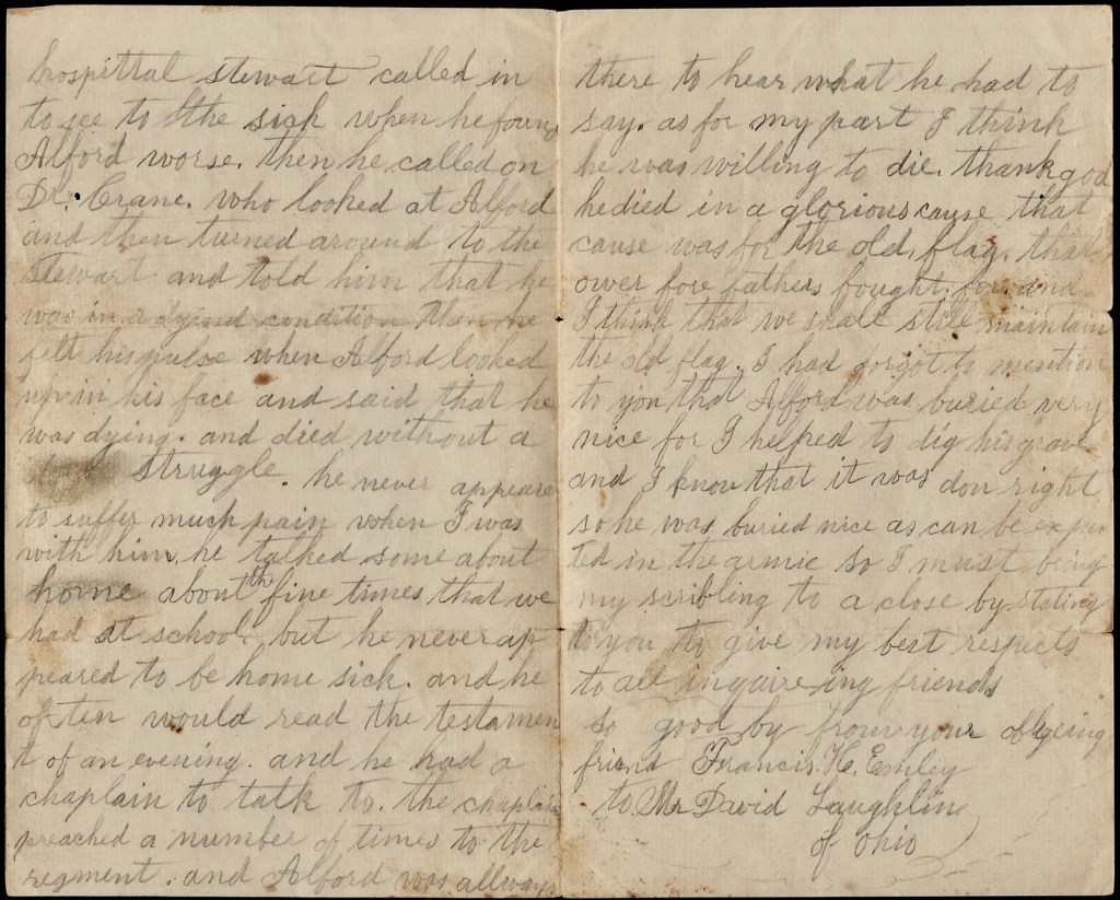 Frank’s letter was addressed to David Laughlin (1817-1897)—the father of his comrade, Alfred A. Laughlin (1844-1862), who served with him in the same company. According to Frank’s letter, Alfred died of chronic diarrhea on 28 December 1862 at Davies’ Mills, Mississippi. Alfred’s mother was Susan Armel (1819-1904). In 1860, the Laughlin’s lived in Germantown, Montgomery county, Ohio.