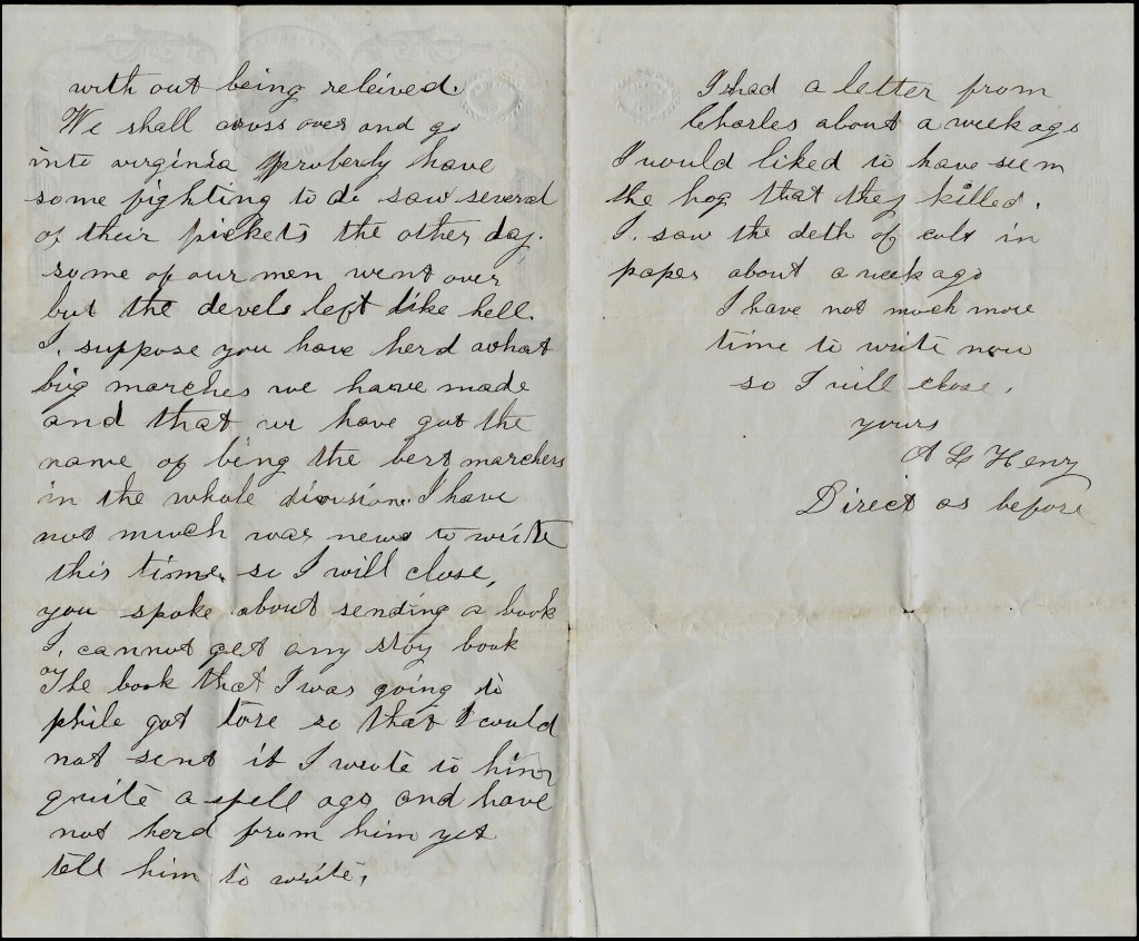 We shall cross over and go into Virginia [and] probably have some fighting to do. Saw several of their pickets the other day. Some of our men went over but the devils left like hell. I suppose you have heard what big marches we have made and that we have got the name of being the best marchers in the whole division. I have not much much war news to write this time so I will close.