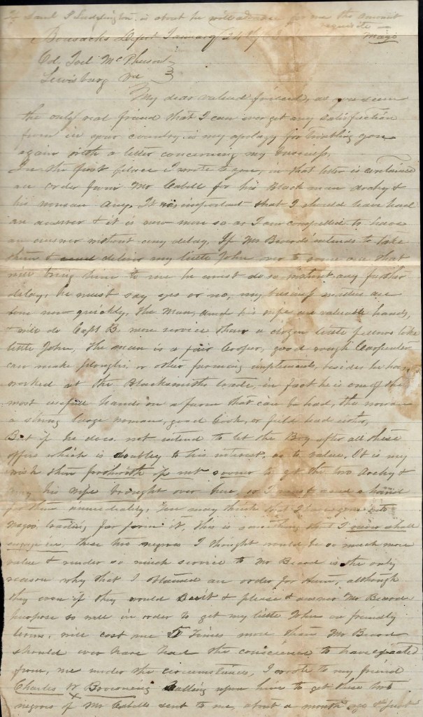 You may think that I have gone into negro trading. Far from it. This is something that I never should engage in. These two negroes, I thought would be so much value & render so much service to Mr. Beard is the only reason why that I obtained an order for them, although they please and answer Mr. Beard’s purpose so well. In order to get my little John on friendly terms will cost me 5 times more than Mr. Beard should ever have the conscience to have exacted from me under the circumstances.