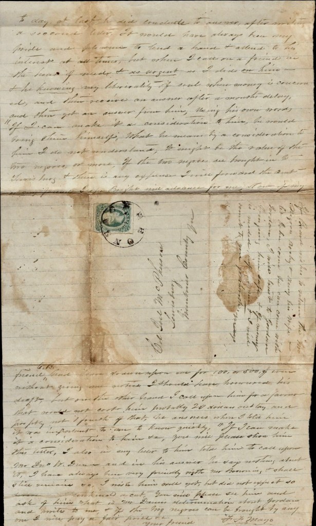 Now if my friend, Charles Browning had have drawn upon me for 100 or $500 even with giving me notice, I should have honored his draft, but on the other hand, I call upon him for a favor that would not cost him probably 20 dollars outlay and probably not one fourth of that. He answers when I told him it was important to me to know quickly, “If I can make it a consideration to him, &c.” You will please show him this letter. I also in my letter to him told him to call upon Mr. Jno. W. Dunn and in his answer he says nothing about it. I have always been very friendly with Mr. Browning & shall still remain so. I wish him well yet, but did not expect so severe and unkind a cut. You will please see him and ask of him what is Mr. Dunn’s determination about Jordan and write to me & if the two negroes can be bought by anyone, I will pay a fair price. Your friend, — F. F. Mayo