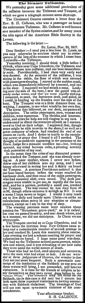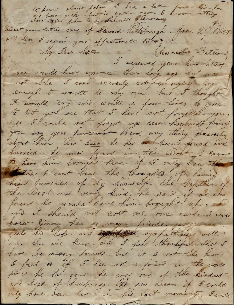 In this January 1848 letter, 30 year-old Cornelia (Smith) Butler (1817-1907) relates in detail the accidental death of her husband James Thomas Butler, when the steamboat Tempest collided with the steamboat Talisman on the Mississippi river a half mile below Cape Giradeau on 19 November 1847.