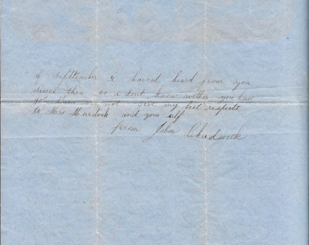 In the 1850 US Census, 5 year-old John was enumerated in his parents home in Seymour, New Haven, Connecticut. His parents were Frederick and Martha E. (Rhodes) Chadwick. In the 1860 US Census, John—now an orphan—was enumerated in the household of Mathew (“Matti”) G. Murdock, a carpenter in Westbrook, Middlesex county, Connecticut. It was Mr. Murdock to whom this letter was most likely addressed.