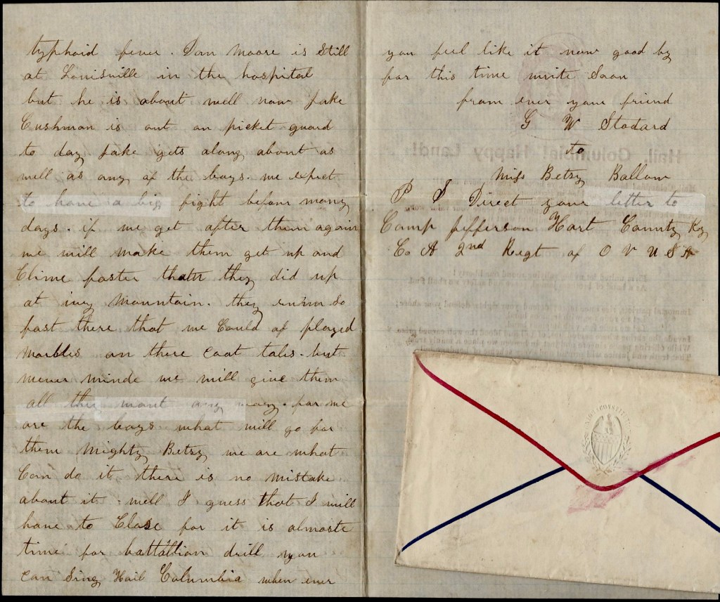 Well, Betsy, soldiering goes about the same as ever with me but it has about used some of the boys up. Ell, James Dee and Cit [Christopher] Cranston is sick and I am afraid that they are a going to be very sick. I think that Dee has got the typhoid fever. Dan[iel D.] Moore is still at Louisville in the hospital but he is about well now. [Julius] Jake Cushman is out on picket guard today. Jake gets along about as well as any of the boys.