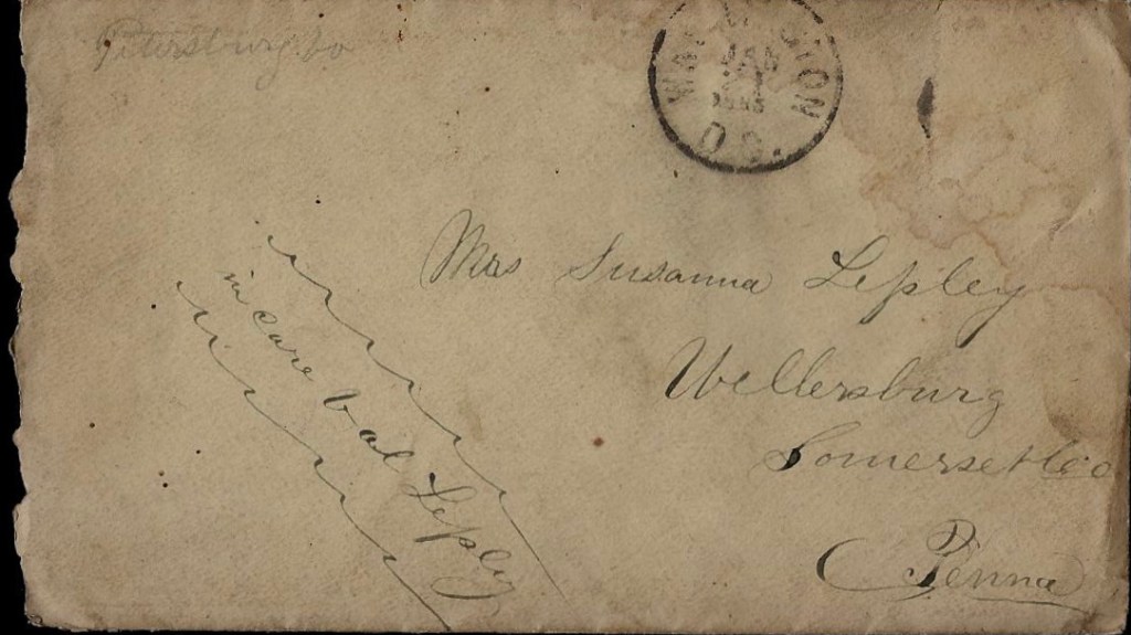 John was the son of Valentine Lepley (1803-1894) and Lydia Elizabeth Beal (1801-1841) of Southampton, Somerset county, Pennsylvania. In December 1861, he married 19 year-old Susana Eiber (1842-1925) and the couple would eventually have at least eleven children but only the the first two were born by the time this letter was written in June 1865. Agnes (“Aggy”) was born on 5 December 1862, and Ida Catharine (“that other little gal” whom he had not yet seen) was born on 20 March 1865.