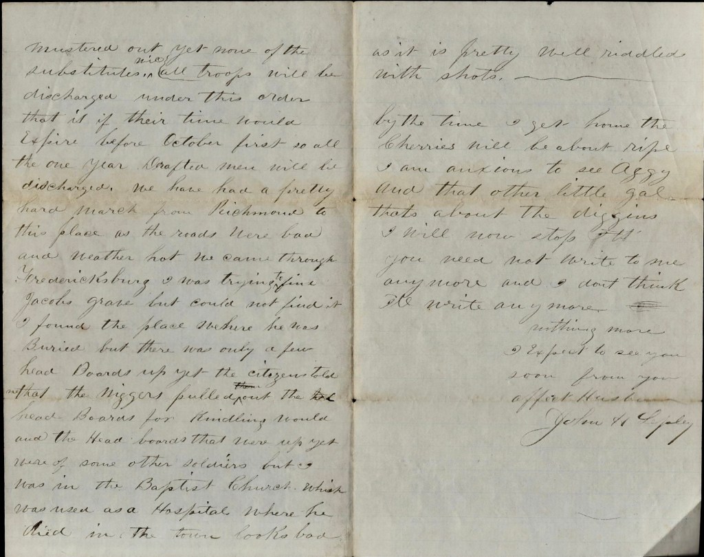 By the time I get home, the cherries will be about ripe. I am anxious to see Aggy and that other little gal that’s about the diggins. I will now stop. you need not write to me any more and I don’t think I’ll write anymore.