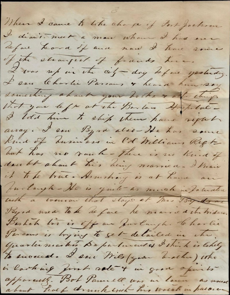 When I came to take charge of Fort Jackson, I didn’t meet a man whom I had ever before heard of and now I have some of the strongest of friends here. I was up in the city day before yesterday. I saw Charlie Parsons & heard him say something about your books & other things that you left at the Bartow Hospital. I told him to ship them home right away. I saw Byrd also. He has some kind of business in Col. Williams’ regiment but has no rank. There is no kind of doubt about his being married. I know it to be true. Armstrong is at home on furlough. He is quite as much infatuated with a woman that stays at Mrs. Byrds as Byrd used to be before he married the widow. Bastick too is off on furlough. Charlie Parsons is trying to get detailed in the Quartermaster’s Department & I think is likely to succeed. I saw Wils (your brother) 1 who is looking first rate & in good spirits apparently. Bob Parmell was in town as usual about half drunk with his watch in [ ] for $10.00. It is necessary to say that he was unable to redeem it up to his time of leaving for his company.