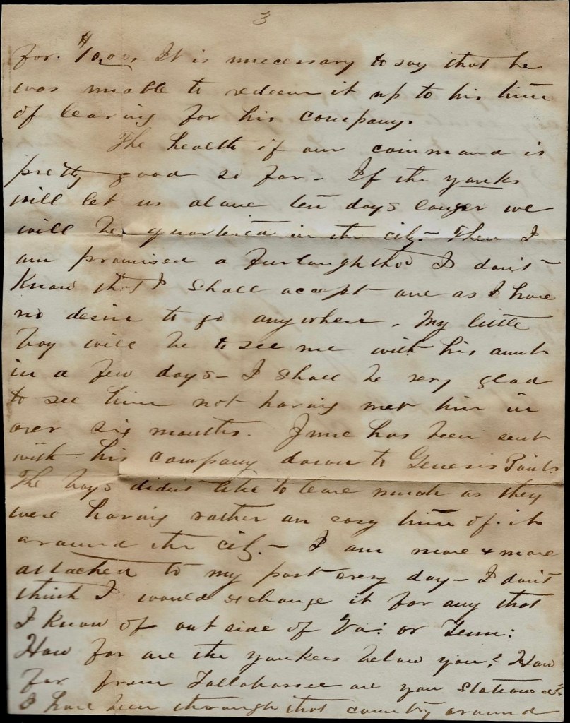 I am more and more attached to my post everyday. I don’t think I would exchange it for any that I know of outside of Virginia or Tennessee. How far are the Yankees below you? How far from Tallahassee are you stationed? I have been through that country around Tallahassee a great deal. Write me a long letter & give me a history of any events that may transpire in your travels.