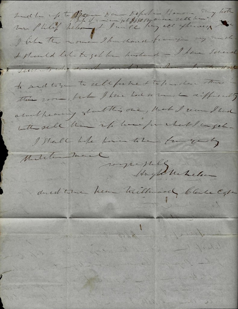 I wrote you in my letters to keep her about ten days and unless Mr. John Pass of Hanover wrote to you to send her up to Hanover to him, to sell her to the highest bidder for cash. If you haven’t sold her as yet, unless she will clear me $650, I will thank you to send her up to Beaver Dam Depot, Hanover. My brother, Mr. Philip Nelson, and I will pay all expenses.