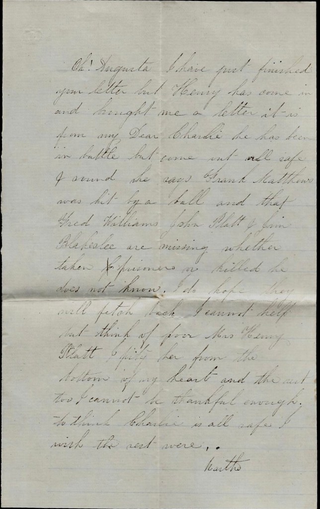 Oh! Augusta, I have just finished [writing] your letter but Henry has come in and brought me a letter. It is from my dear Charlie. He has been in battle but come out all safe & sound. He says Frank Matthews 1 was hit by a ball and that Fred Williams, 2 John Platt, 3 & Jim Blakeslee 4 are missing. Whether taken prisoners or killed, he does not know. I do hope they will fetch back. I cannot help but think of poor Mrs. Henry Platt. I pity her from the bottom of my heart and the rest too. I cannot be thankful enough to think Charlie is all safe. I wish the rest were. — Martha