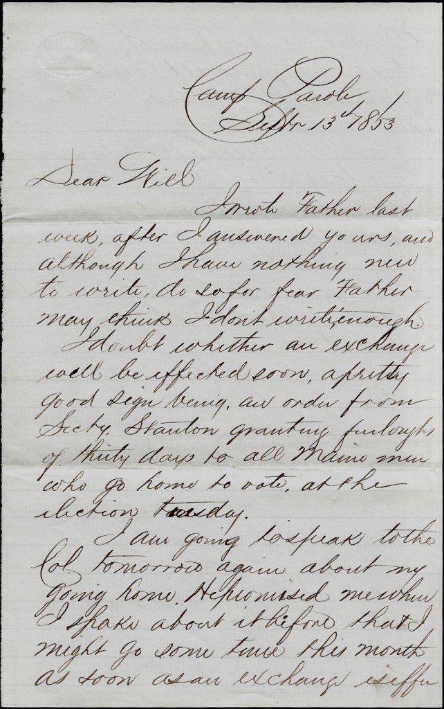 I doubt whether an exchange will be effected soon, a pretty good sign being an order from Secretary Stanton granting furloughs of thirty days to all Maine men who go home to vote at the election Tuesday.