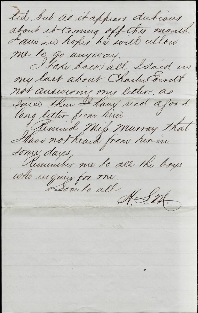 I take back all I said in my last about Charlie Everett not answering my letter as since then I have received a good long letter from him. Remind Miss Murray that I have not heard from her in some days. Remember me to all the boys who enquire for me.