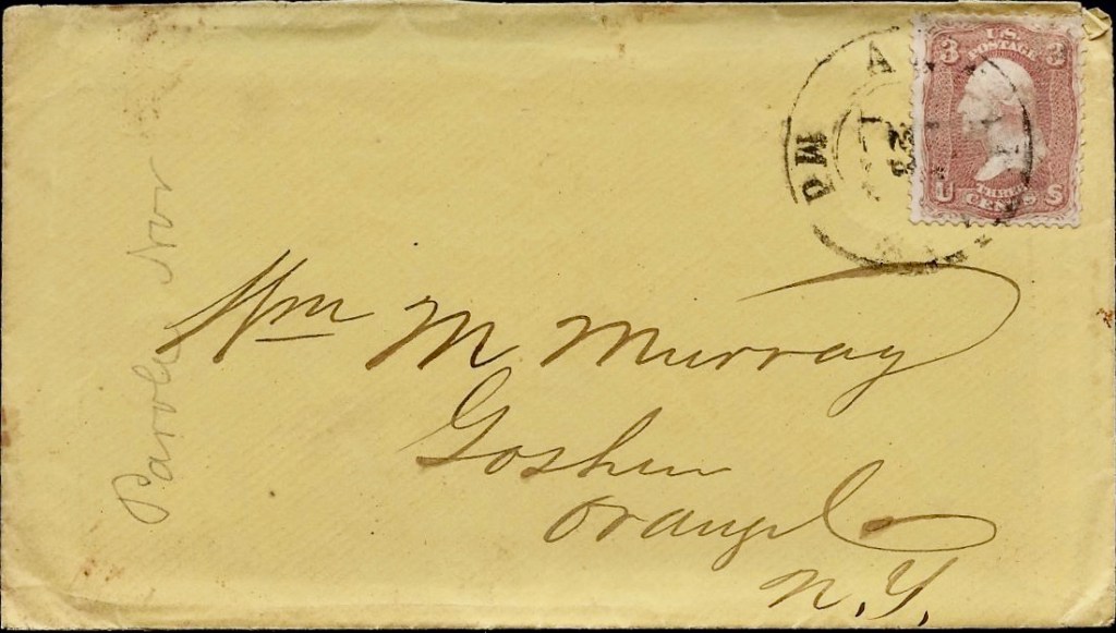 The following letters were written by Henry Spencer Murray (1840-1874), the son of William Murray (1803-1875) and Ellen Maria Matlack (1809-1895) of Goshen, Orange county, New York. Henry’s father was a former US Congressman, representing New York’s 9th & 10th Districts in the US House of Representatives from 1851 to 1855. Two of the three envelopes were addressed to Henry’s older brother, William Matlack Murray (1838-1897), a tinner by trade.