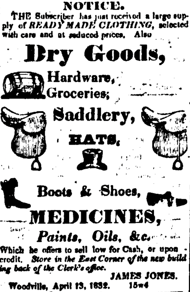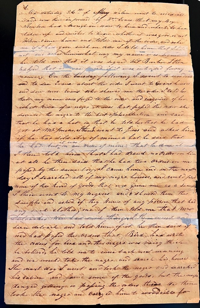 On the Thursday following I went to Woodville to see Evans about the order. I went to Evans’ house and saw Mrs. Evans who showed me the order. I told her that my name was forged to the order and enquired of her what kind of a negro it was that passed the order. She described the negro to the best of her recollection and said that he had a hat on that he told her he had got at Mr. [James] Jones’s. I then went to Jones and asked him if he had sold a boy of mine a hat. He said that he had but it was on an order of mine that he done it. I then told him that I had drawed no order on him at all. He then said that he had two orders on me passed by the same boy. I came home and on the next day I searched all of my negro houses and could find none of the kind of goods that was given me as a sample. I then went to my negroes and showed them the samples and asked if they knew of any person that has such clothes; one of them told me that Mr. Deloroches’ Ned had such them goods. I then went and seen Delroch and told him of it. He then said if Ned had passed the orders that Bird had wrote the orders, for Bird and the negro was very thick he believed. He told me to come back next morning and he would take the negro and search his house.