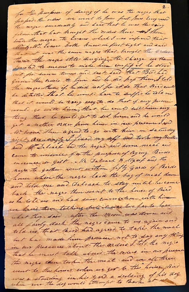 The negro walked up to the palin and set the bag on the top of the palin & I walked in about 5 or 6 feet of the palin and stopped. Delroch stopped immediately behind me. After he had got the dog reconciled, he stepped to the fence immediately between me and him and commenced looking at me very close. I thought he wanted to see me good. I stepped up close to the fence where he was and laid my hand on the fence close to where he had his. He then looked at me good. He had looked at me for some time. He then turned his head to one side as if to look at Delroch which was immediately behind me. He looked at Delroach for some time. Then he went down the fence a few feet to where the negro was with the meal and laid his hand on the bag and said to the negro it is a very hard matter to trade now. Times is very squally. People watches very close. And then [he[ came back and took another look at Deloach & myself. He then went back and felt the bag. The negro asked him what he wanted. He said that he wanted to taste the meal but the bag was tied. The negro then untied the bag. There was some noise heard. Bird then stepped back against the side of his house and said some person was coming. I sorter squatted down against the paylen and asked Bird if there was any patrol about. He said he believed not—that he had heard no noise about lately. I expressed some fear of the patrol. He told me that they never came in that part of town—that he had got in that part of town on that account (all was still again).