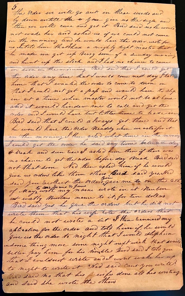 Ned then asked him if he would give us orders like them others. Bird said yes. Ned said you recollect he orders you give me on the 6th of May to Mr. Evans and Mr. Jones with my name wrote in it, Reuben, and Watly Burton’s name to it, for ten dollars. Bird said yes, he gave the orders but he did not write them—that his wife wrote the orders—that he could not write a bot. I then renewed my application for the order and told him if he would give us the order tonight, that I would slip him in something more some night next week that would better pay him for his trouble. Bird said I told you that I could not write and I won’t waker her up tonight to write it. Ned said can’t you write? Bird said, no, that his wife done all his writing and said she wrote the others.