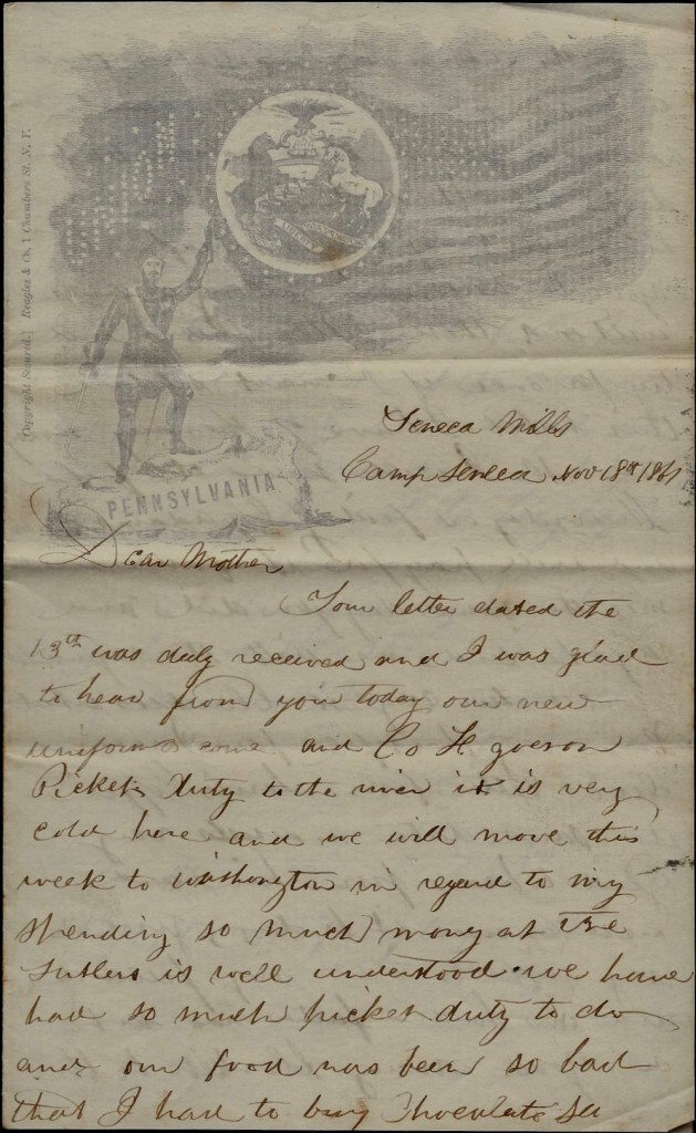 Because it was written on “Pennsylvania” patriotic stationery and given that he author mentions Company H in the letter, my assumption is that he served in that company in a Pennsylvania Infantry regiment but I have not been able to identify the regiment that was posted at Seneca Mills, Maryland, on that date.