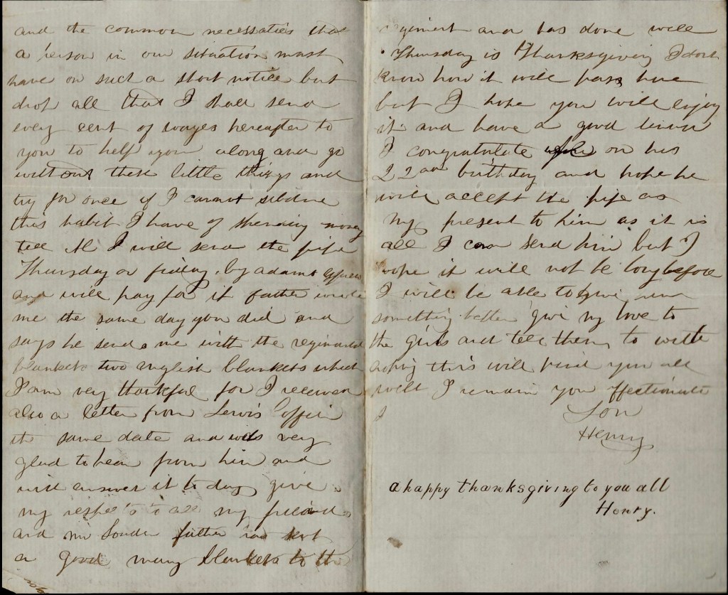 Give my love to the girls and tell them to write. Hoping this will find you all well, I remain your affectionate son, — Henry