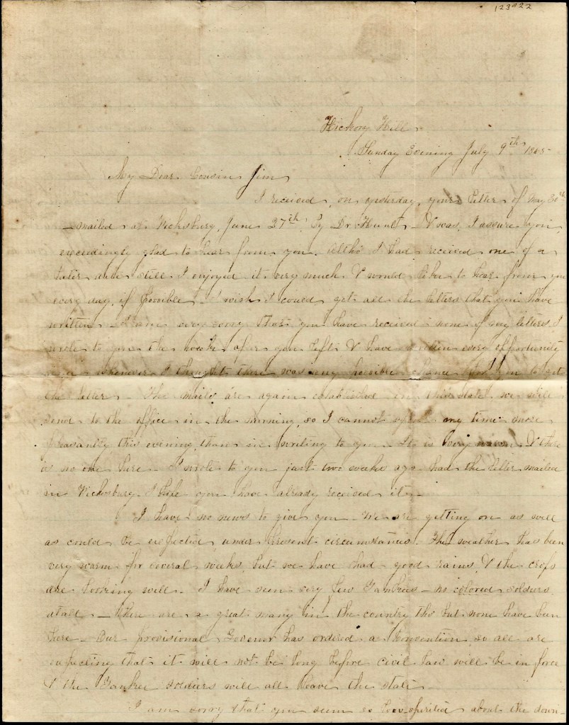 I received on yesterday your letter of May 30th mailed at Vicksburg June 27th by Dr. Hunt & was, I assure you, exceedingly glad to hear from you. Altho’ I had received one of a later date, still I enjoyed it very much & would like to hear from you every day if possible. I wish I could get all the letters that you have written. I am very sorry that you have received none of my letters. I wrote to you the week after you left & have written every opportunity since—whenever I thought there was any possible chance for you to get the letter. The mails are again established in this state. We still send to the office in the morning so I cannot spend my time more pleasantly this evening than in writing to you. It is very warm & there is no one here. I wrote to you just two weeks ago. Had the letter mailed in Vicksburg. I hope you have already received it.