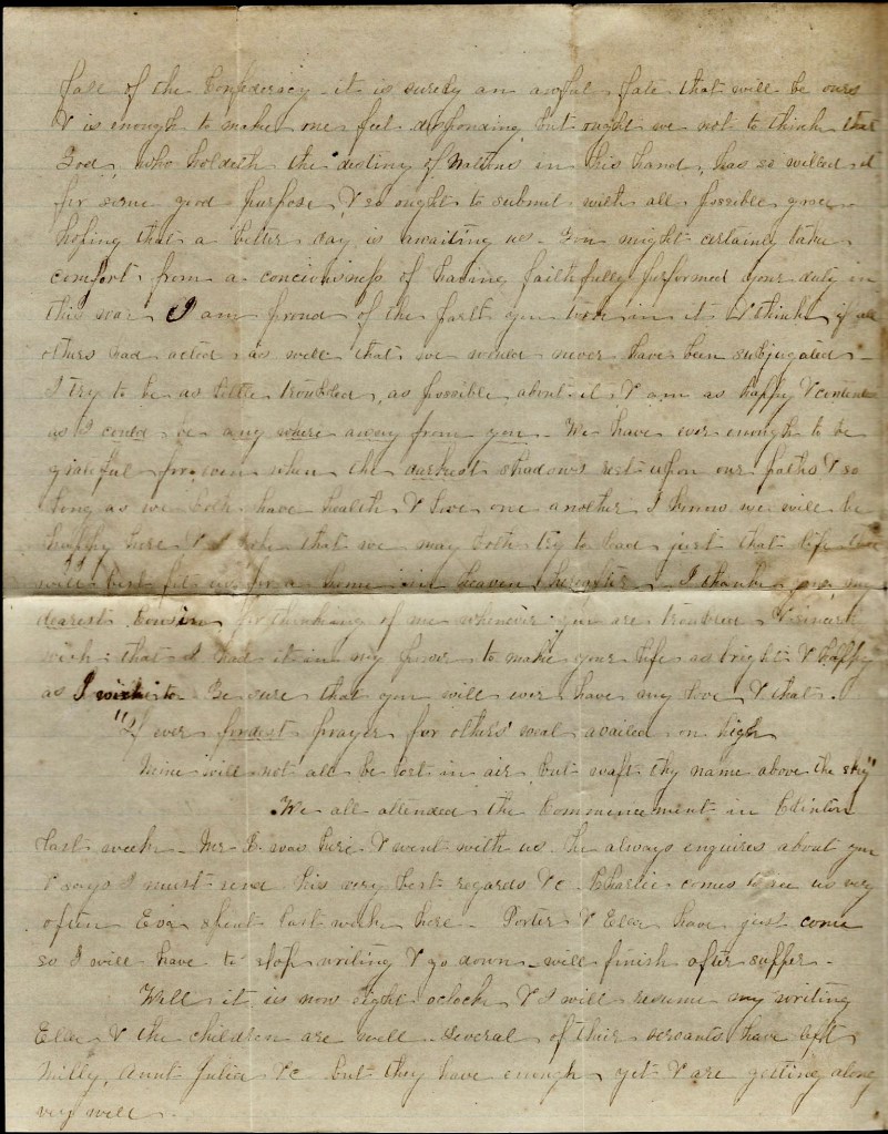 I am sorry that you seem so low-spirited about the downfall of the Confederacy. It is surely an awful fate that will be ours & is enough to make me feel desponding, but ought we not to think that God, who holdeth the destiny of Nations in His hand, has so willed it for some good purpose & so ought to submit with all possible good, hoping that a better day is awaiting us. You might certainly take comfort from a consciousness of having faithfully performed your duty in this war. I am proud of the part you took in it. I think if all others had acted as well that we would never have been subjugated. I try to be as little troubled as possible about it & am as happy & contented as I could be anywhere away from you. We have ever enough to be grateful for even when the darkest shadows rest upon our paths & so long as we both have health & love one another, I know we will be happy here & I hope that we may both try to lead just that life that will best fit us for a home in heaven hereafter. I thank you, my dearest cousin, for thinking of me whenever you are troubled & my sincerest wish is that I had it in my power to make your life as bright & happy as I wish it. Be sure that you will ever have my love & that,