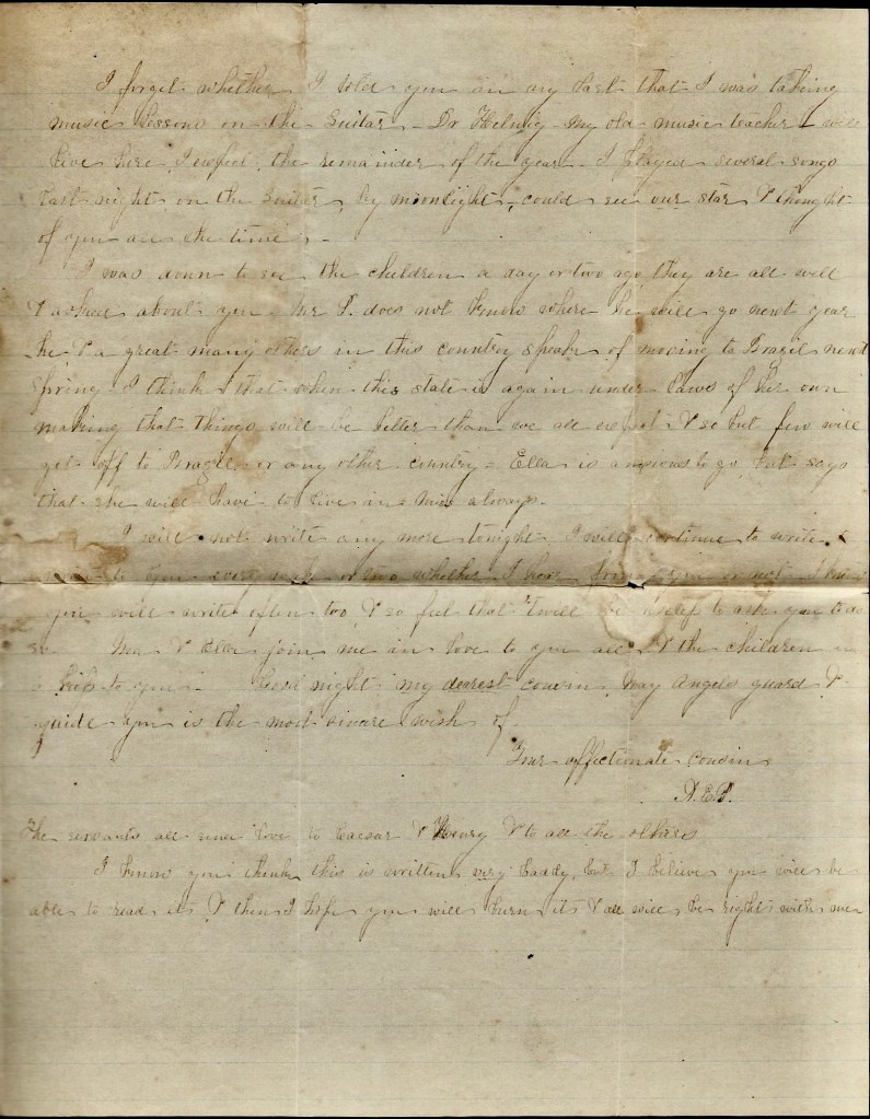 I will not write any more tonight. I will continue to write you every week or two whether I hear from you or not. I know you will write often too & so feel that t’will be useless to ask you to do so. Good night, my dearest cousin. May Angels guard & guide you is the most sincere wish of your affectionate cousin, — A. E. P.