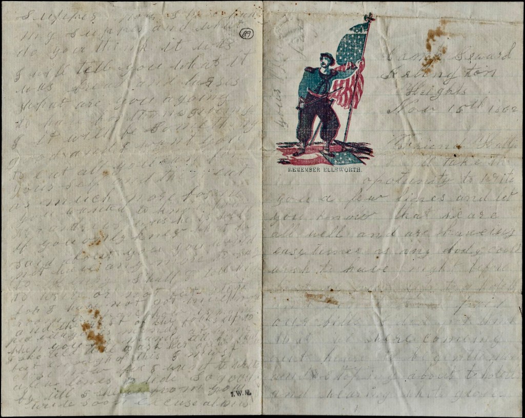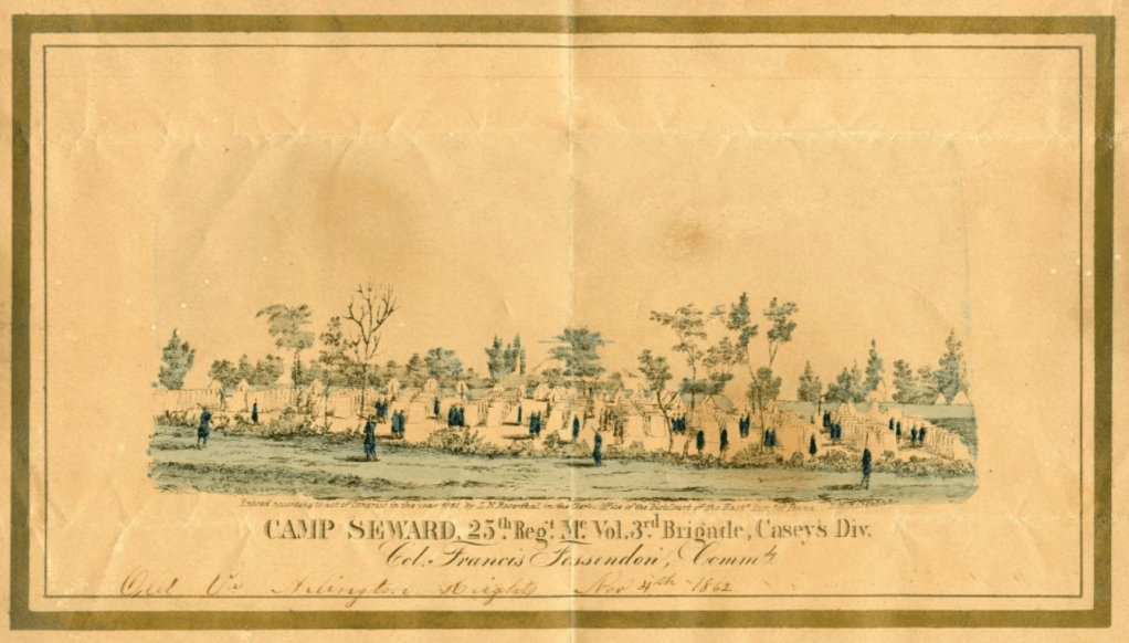 I cannot make out the surname of this soldier whom I believe served in the 25th Maine Infantry. This regiment mustered into service on 29 September 1862 for nine-months’ and was stationed at Camp Seward, Arlington Heights, Virginia, on November 4, 1862. The camp, located across the Potomac River from Washington, D.C., provided defense fortifications for the city during the war. Camp Seward was named for William Seward, Lincoln’s Secretary of State and former rival for the presidency.