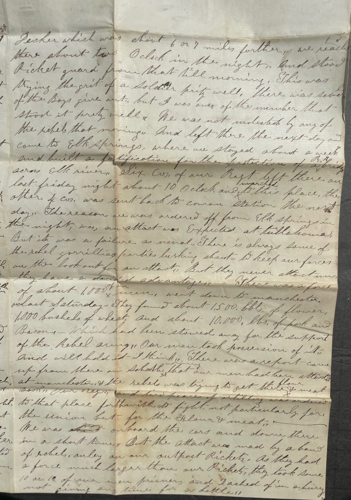 There was a force of about 1,000 of our men went down to Manchester on last Saturday. They found about 1500 barrels of flour, 1,000 bushels of wheat, and about 10,000 lbs. of pork and bacon which had been stowed away for the support of the rebel army. Our men took possession of it and will hold it, I think. There was a report came up from there on Sabbath morning that our men had been attacked at Manchester and the rebels was trying to get their flour and meat back. Our regiment and two pieces of artillery was ordered to that placed forthwith to fight, not particularly for the Union, but for the flour and meat. We was on board the cars and down there in a short time but the attack was made by a band of rebels only on our outpost pickets. As they had a force much larger that our pickets, they took some 10 or 12 of our men prisoners and dashed off in a hurry, not giving any time for a battle. Some of our men are now in pursuit of the rebels which are encamped down about McMinnville so that is their harboring place. It is to be hoped they (our men) will be successful in catching them.