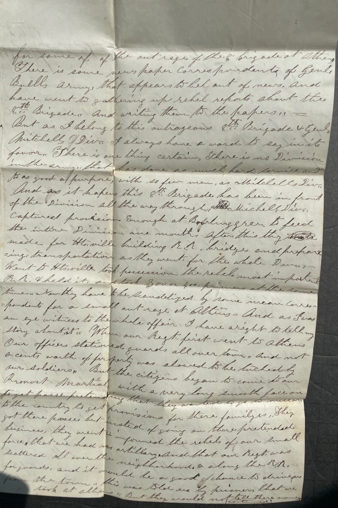 Various changes are taking place in our army. Gen. Mitchell is sent off it is said to Virginia. There are various rumors but I don’t know for certain what for, Brig. Gen. Smith has command of the 3rd Division, all the Brigades and Regiments about here are divided into various parts guarding what they have got and several officers of our Brigade are undergoing a court martial for some of the outrage of the 8th brigade at Athens. There is some newspaper correspondents of Gen. Buell’s army that appears to be out of news and have went to gathering up rebel reports about the 8th Brigade and writing them to the papers. But as I belong to this outrageous 8th Brigade & Gen. Mitchell’s Division, I always have a word to say in its favor. There is one thing certain, there is no Division in the army that has done as much hard service and to as good a purpose with so few men as Mitchell’s Division. And as it happens, this 8th Brigade has been in front of the Division all the way through.