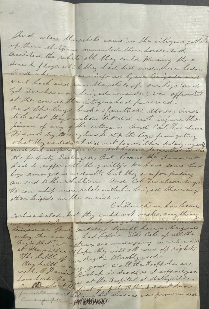 I did not favor the policy myself and took no part in it, not because I regretted to see the property destroyed, but because the innocent had to suffer with the guilty. We have some had boys amongst us no doubt but they are for putting an end to to the rebellion. And Col. Turchin says he can whip more rebels with his Brigade than another other Brigade in the service. Col. Turchin has been court martialed but they could not make anything out against him and he has got a commission as Brigadier General and says he will have no brigade only the one he had before. The colonels of all the regiments that was at Athens are undergoing court martials at Huntsville. I hope they will all come off right. The health of our regiment is tolerably good. My health is very good & all the Hooppole [boys] are well.